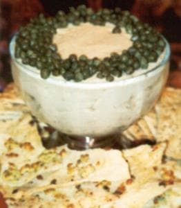 Spoon the mixture into a 2 ½-cup soufflé dish. To garnish, spoon capers or chopped black olives around the edge of the bean purée. Serve with assorted cracker breads.