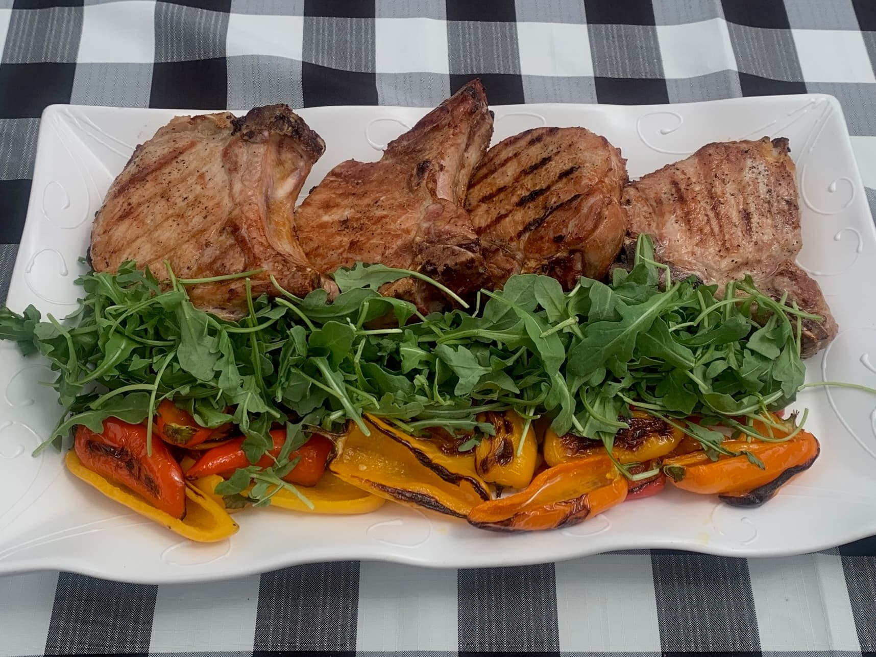 Pour the marinade into a small saucepan and bring it to a boil. Reduce the heat to medium-low and simmer a minimum of 10 minutes so the meat juices in the marinade are thoroughly cooked. To serve, place the chops on a platter, garnish with arugula and charred peppers, and drizzle the meat with the cooked marinade.