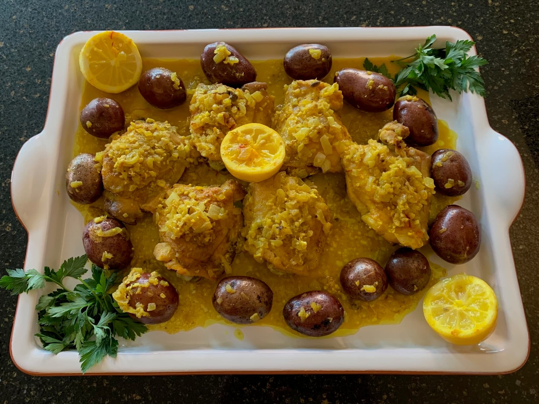 Distribute the onion mixture over the top of the thighs. Sprinkle each with lemon zest, turmeric, and a pinch of saffron threads. Pour ¾ cup water around the chicken thighs, cover, and cook 20 minutes. Add small potatoes, cover, and cook 25 to 30 minutes more until the potatoes are knife tender and the chicken reaches 165 degrees on an instant read thermometer. Add a little extra water to the pan if needed during the cooking process.