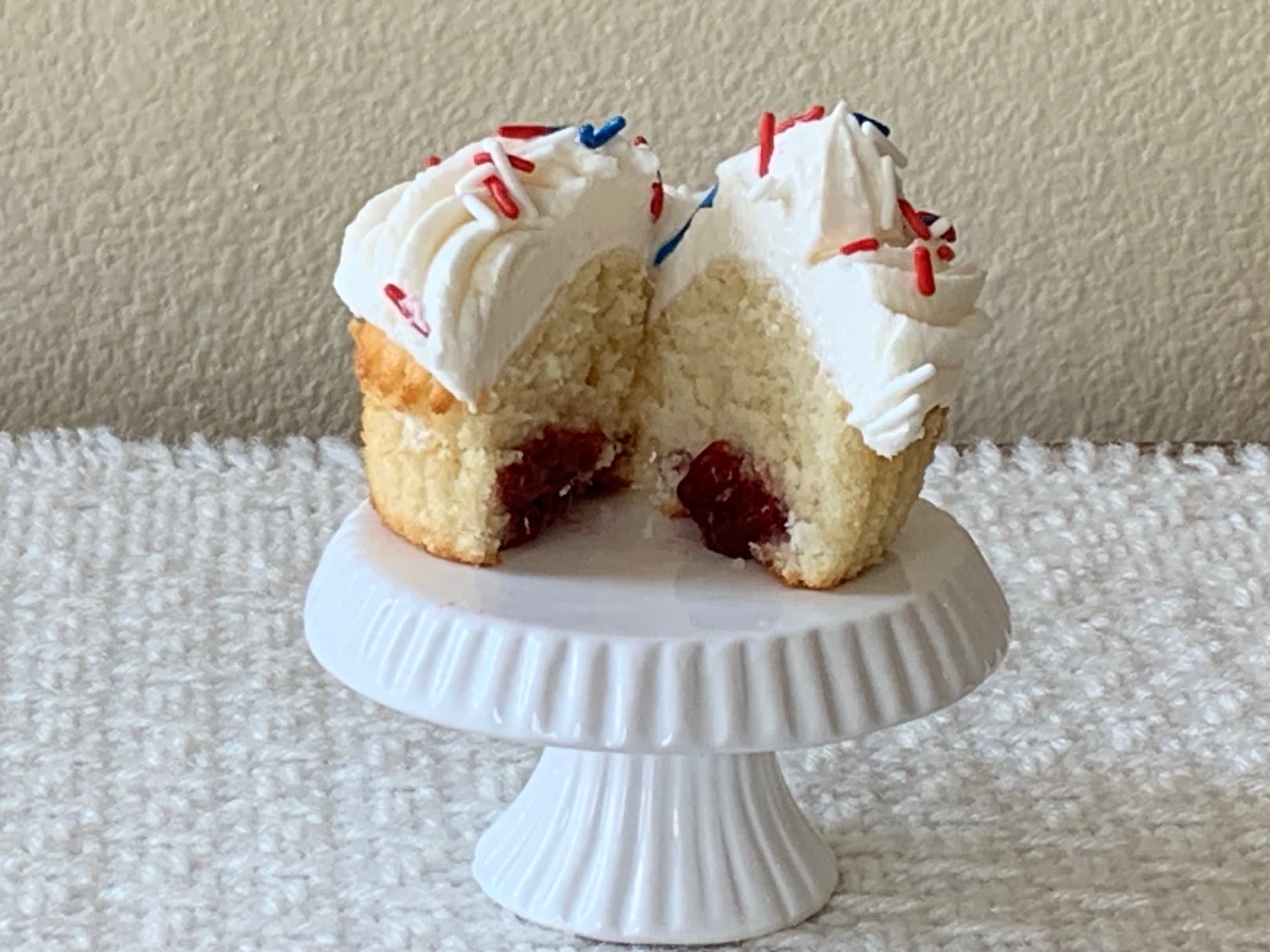 Remove the pans from the oven and transfer the cupcakes from the pans to a wire rack while they’re still hot so they don’t become soggy. Cool completely, frost with a swirl of Fluffy Whipped Cream Buttercream, and garnish with red, white, and blue sprinkles. Yield: 16 cupcakes